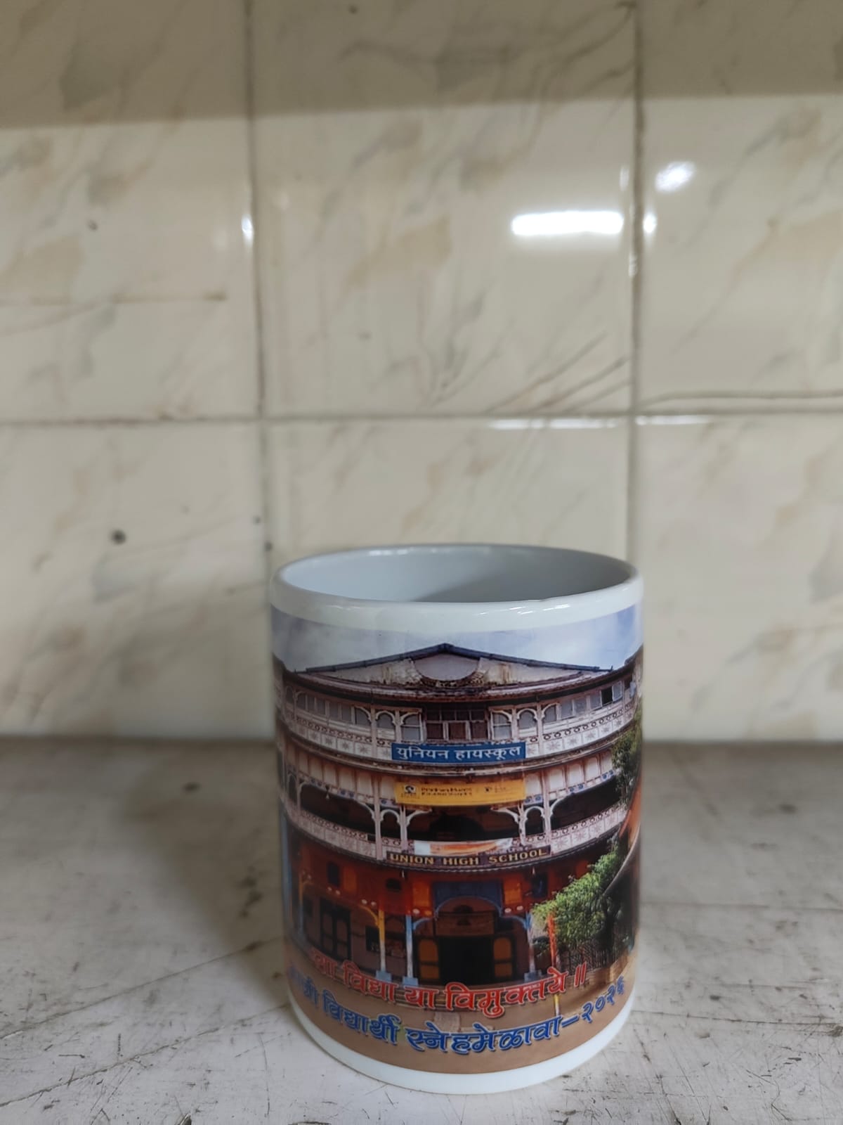 होय,या वर्षीच्या माजी विद्यार्थी स्नेहमेळाव्याच्या निमित्ताने स्नेहमेळाव्याची आठवण म्हणून सर्वांसाठी एक सुंदरसा कप ( Mug ) ज्यावर आपल्या युनियन शाळेचं सुंदर चित्र आहे,जो घरी चहा/काॅफी पितांना आपल्या शाळेची आठवण करून देईल. शोकेसमध्ये ठेवला तरी पहायला मजा येईल. इतकंच काय? पेनस्टँड म्हणूनही टेबलावर ठेऊन वापरता येईल,असा बनविण्यात आला आहे.